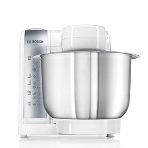 Bosch-Kchenmaschine-MUM4-600-Watt-Edelstahl-Rhrschssel-Durchlaufschnitzler-Mixeraufsatz-Kunststoff-Fleischwolf-wei