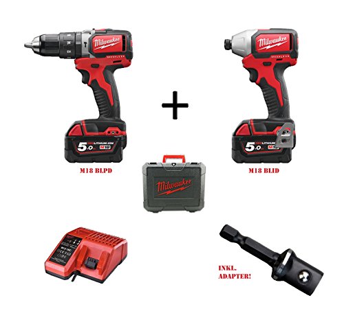 Milwaukee-18V-brushless-Schlagbohrer-Schlagschrauber-Set-M18-BLPDM18-BLID-mit-2x-Red-Li-Ion-Akkus-18V-50-Ah-und-Ladegert-inkl-Shockwave-Adapter