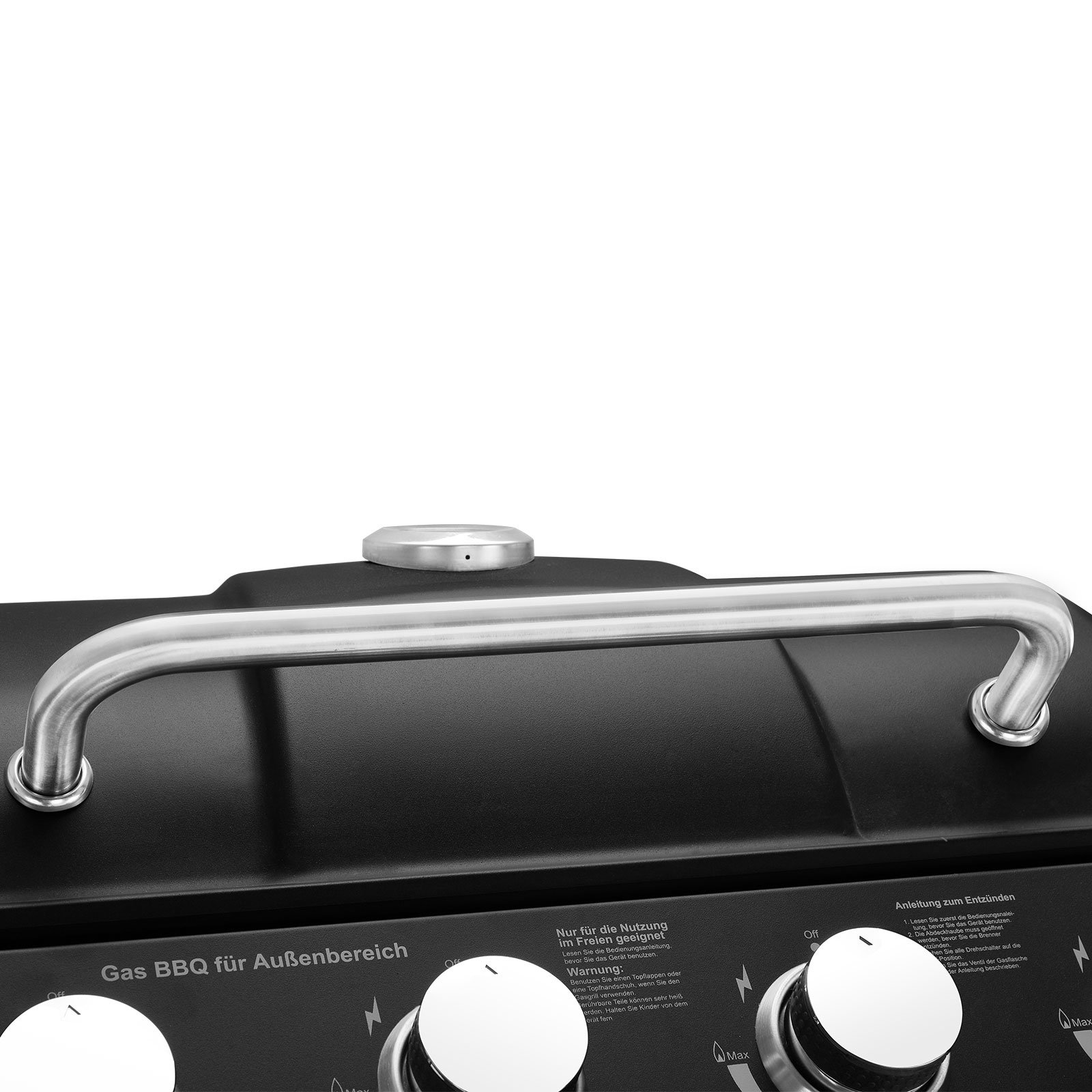 Durch die hochtemperaturfeste Pulverbeschichtung (bis über 500°C) des Grills und die emaillierten Roste ist der Gasgrill enorm strapazierfähig und langlebig. Der große Frontgriff ist ebenso wie die Brenner und Flammenherde aus hochwertigem Edelstahl hergestellt.