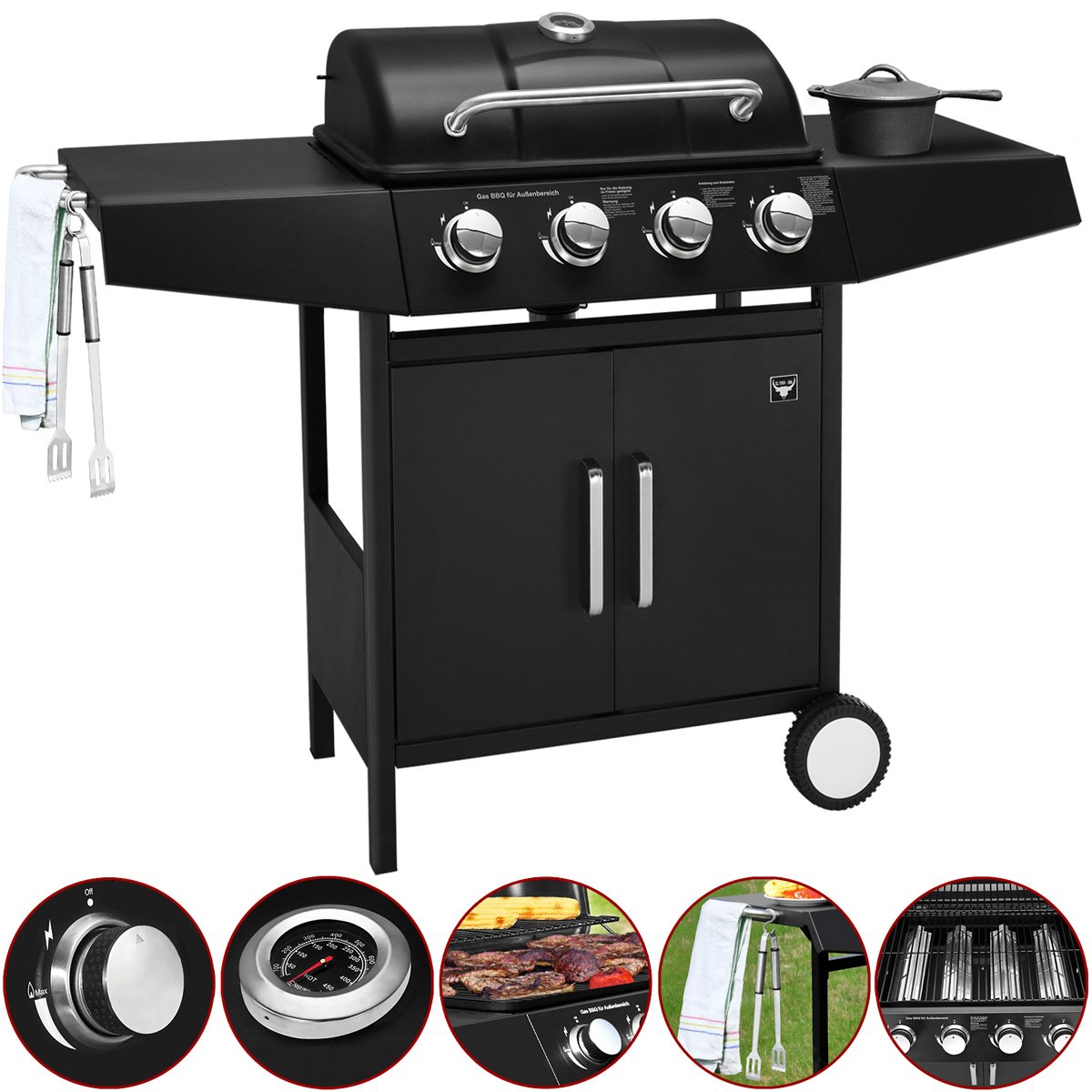 Der robuste Gasgrill von „El Toro BBQ“ ist mit 4 Hauptbrennern ausgestattet. Diese lassen sich individuell regulieren und ermöglichen Ihnen somit die Hitze optimal auf Ihr Grillgut abzustimmen. Die im Deckel verbaute, automatisch mitschwingende Warmhaltefläche, eignet sich perfekt um Ihre gegrillten Köstlichkeiten ruhen zu lassen oder warm zu halten. Das intergrierte Thermometer ermöglicht Ihnen eine optimale Zubereitung Ihres Grillguts.