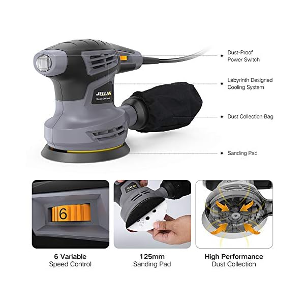 Jellas Exzenterschleifer mit Absaugung, Staubfangbehälter, staubgeschütztem Schalter & Getriebegehäuse – 280W – 125mm…