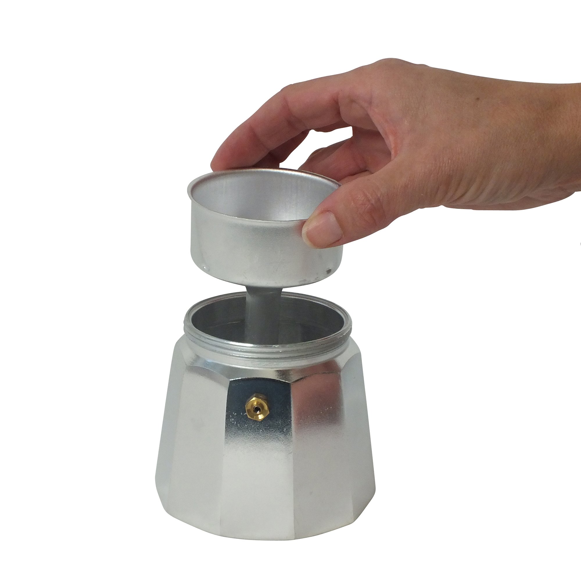 Schnelle Zubereitung: Befüllen des Kocher-Bodens mit Wasser, Befüllen des Trichtereinsatzes mit Espressopulver, Aufschrauben Kocher-Oberteil auf Unterteil, Platzierung auf Herd